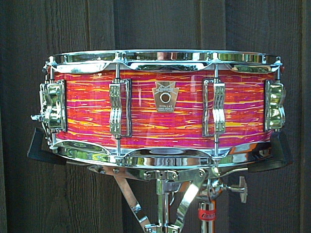 Here's a rarity. The Ludwig Jazz Festival was a 5"X14" wood snare with eight lugs and the P-83 snare strainer. They've been very collectable over the last few years. Pink Oyester Pearl was only offered for 2 years or so, like 1958-59. I personally love the color, but not many were sold.